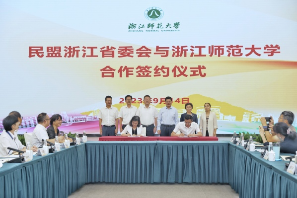 该图片拍摄于2023年9月,记录了民盟浙江省委会与浙江师范大学签署合作协议的现场场景,反映了学校在拓展统一战线工作方面的最新进展。民盟作为以文化教育科技界中高级知识分子为主的民主党派,与浙江师范大学有着深厚的合作基础。此次签约正值全面建设社会主义现代化国家新征程的关键时期,双方围绕人才培养、智库建设、社会服务等领域达成战略合作,充分体现了新时代统一战线工作的创新实践。这是学校党委贯彻落实新时代党的统一战线工作的重要成果,展现了学校开放办学、整合社会资源的战略眼光。通过建立长效合作机制,双方将充分发挥各自的优势,共同为浙江省“两个先行”建设贡献智慧力量。