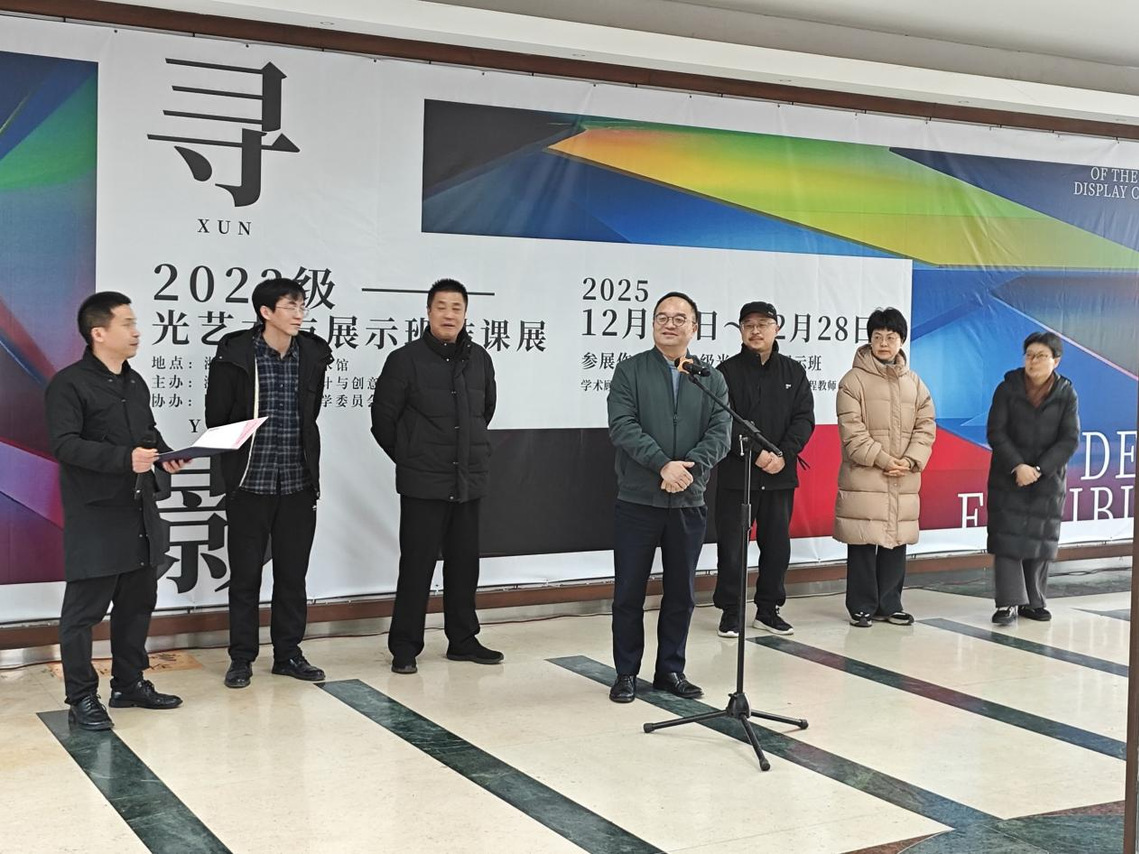 2025年12月26日,民盟浙江师范大学委员会与校设计与创意学院在浙师大美术馆联合举办“寻影——设计与创意学院2023级光艺术展”。展览由民盟浙师大委员会秘书长章国新指导,以朱光潜“提灯寻影”美学论述为主题,展出30余件学生光艺术作品,探索光在艺术中的独特表现功能。展览融合艺术与科技、装置与美学,为跨学院项目制教学与合作提供了实践案例。